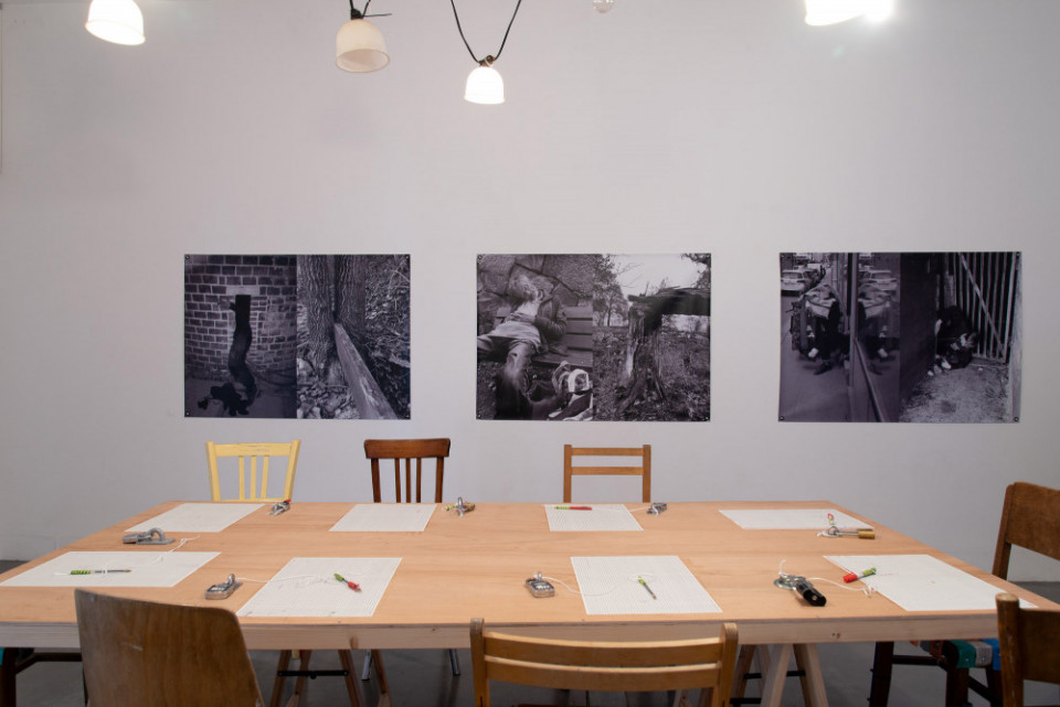 The ensemble features elements gleaned from Montbéliard and Stockholm. Cars, bicycle frames, padlocks, models of their living spaces, images of their performance or architectural actions, all become fragments of a succession of monumental, indexical or even hidden constructions; pieces of a narrative linked to their urban explorations and to be completed by the imaginations of those who visit the exhibition. The videos produced in the Pays de Montbéliard, featuring several sequences in which the artists are seen climbing over spaces that are a priori impassable, or walking on palisades and fences, seem to condense the “spirit” of a work seeking a balance between architectural appropriation and an artistic approach situated through action. In many ways, the work is reminiscent of a certain Orwellian dystopian aesthetic that has been widely explored by artists since their early days.