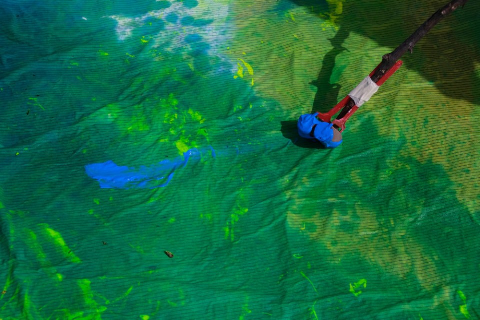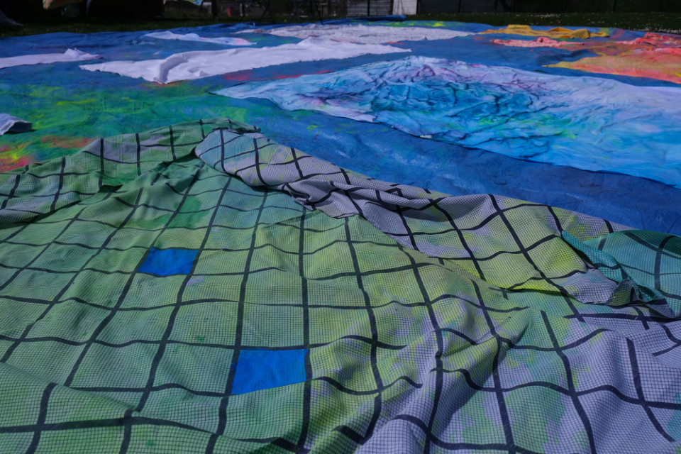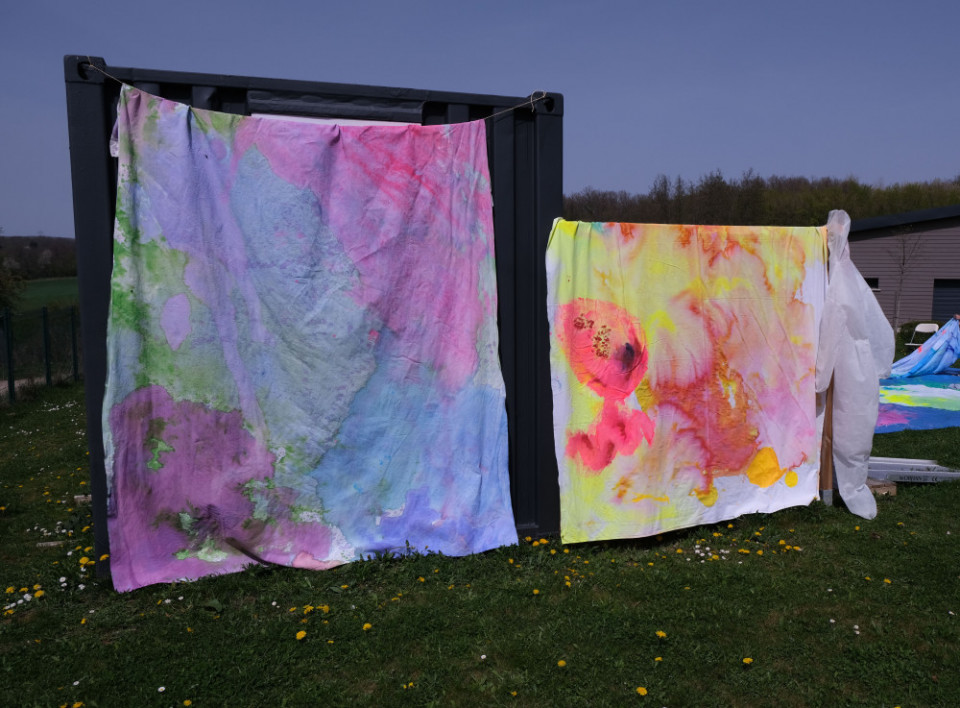 Charlotte Denamur sees painting as a physical and sensory experience of colour in space. She creates baths of coloured paints and inks that she applies to the floor on fabrics, most of which are domestic and gleaned from her surroundings. She then observes the state of the material - opaque, shiny, matt, liquid - and how the substance becomes impregnated and evaporates, or draws an imprint on which she intervenes. The paint becomes a skin that can be manipulated, where the front and back are the same.