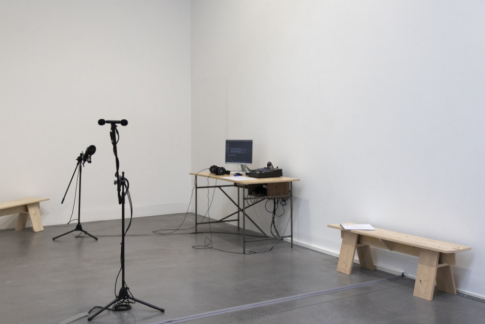 À son ouverture en février, le rez-de-chaussée du centre d’art est en premier lieu un espace du « faire » et de la collecte où le public peut se déplacer et développer des relations ; produire des œuvres sonores où la voix et les mots parlés sont mis en action. À travers divers dispositifs activables, chaque personne contribue à la constitution à terme d’une œuvre commune. L’installation est composée d’objets relationnels conçus ou choisis par Ricardo Basbaum à la suite de sa propre compréhension de l’espace architectural du lieu. Mais il s’agit également pour lui, à travers cette expérience collaborative et selon des principes d’enregistrements, de comprendre la présence des personnes dans le centre d’art, agent•es9 qui font vivre l’ensemble, en se déplaçant autour des œuvres, en entrant en contact avec les dispositifs, en générant des images à travers leurs corps dans l’espace et des sons en jouant les différentes partitions laissées par l’artiste à leur attention.