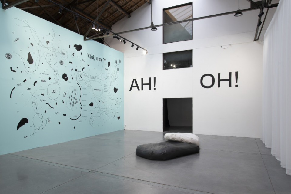 « AH! OH! Lorsque l’on entre dans l’espace de la galerie, deux grands mots sont immédiatement visibles : les deux interjections, accompagnées de points d’exclamation, projettent un son dans l’espace lorsqu’elles sont lues. La présence de ces deux grands mots contribue à activer l’installation dans son ensemble ».8