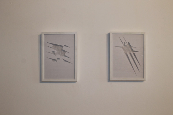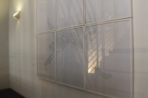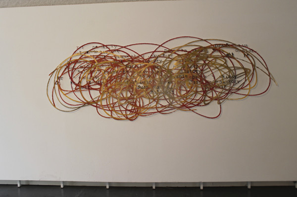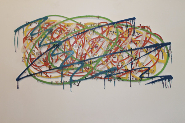 La matière s’accumule et l’image se modifie. C’est là, dans la seconde phase qui se profile que l’artiste travaillera sans filet. Mathias va soustraire avec rigueur. La découpe ne permet pas l’erreur car le travail de broderie de l’artiste tient souvent à un fil. Les traits de peinture qui se croisent et se soutiennent, soutiennent l’image aussi, à moins que ça ne soit le texte qui soutienne la peinture. Le hasard fait place à une certaine logique, une cohérence dans le processus préétabli par l’artiste. Tout le corps ne virevolte plus d’un angle à un autre mais penché sur quelques centimètres carrés, les yeux rivés sur le trait de découpe. L’image prend du temps à se désosser, Mathias Schmied assume ces heures passées à une mise en dentelle minutieuse de la peinture pour en révéler l’armature, le squelette de l’œuvre dirait-il. Il épure mais enrichit l’image imprimée en lui redonnant une certaine noblesse, une complexité qu’elles ont perdues en étant maintes fois dupliquées.