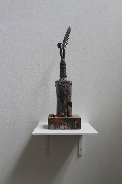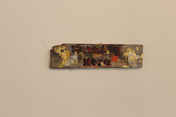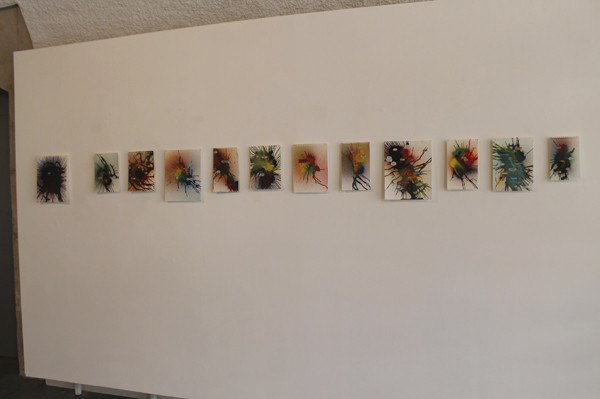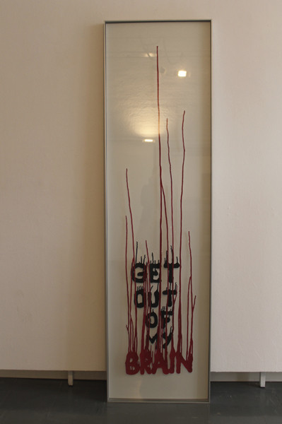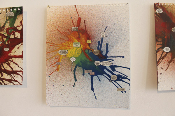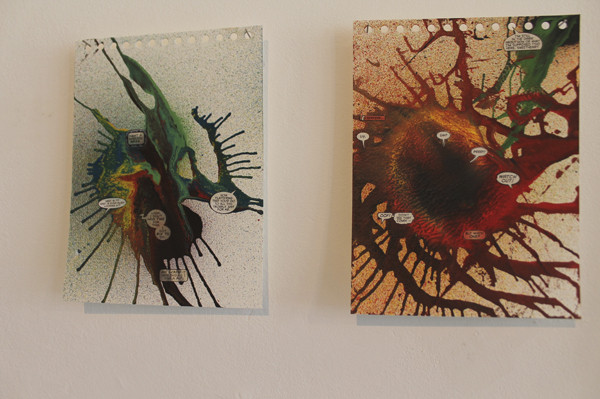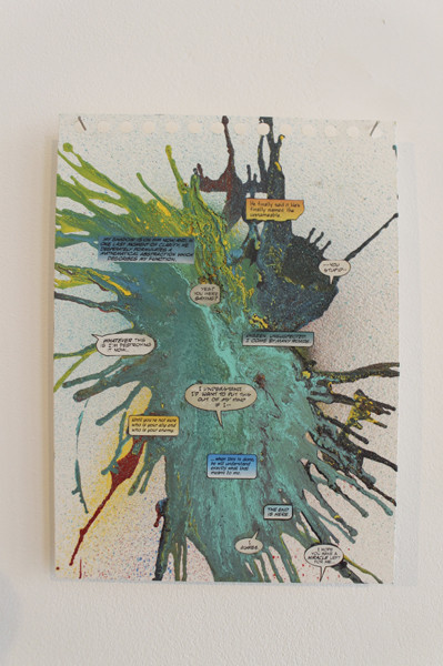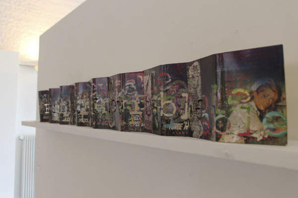 Mathias Schmied assume sa culture pop, curieux de tout il note un refrain, prélève des images de magazines, isole une phrase volée d’un polar ou d’une publicité. Il prélève la matière mais en rajoute au préalable. Il découpe en puisant dans un amalgame de formes et de couleurs, superpose papier imprimé et couches de peinture. Sa pratique est avant tout celle de l’accident, du hasard du geste, d’une coulure, d’un jet de bombe qui lie un élément à un autre. Le support fait le lien, une nouvelle entité plastique se créé. La matière, la couleur se superposent au texte. Tout se tient et s’égalise dans la matière et dans le sens qui émerge de ce tricotage de matière.