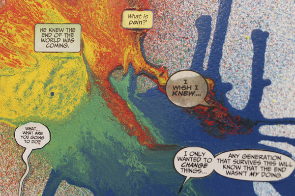 L’artiste confronte des techniques et des temps. Le temps des grands gestes à la Pollock, des coulures et des projections de peinture. Il multiplie les effets, les facilite. Il les provoque avec une cadence qui cache un contrôle lié à l’expérience. Celui du temps de séchage, de la vitesse d’exécution d’un trait de bombe, la combinaison des couleurs ou la qualité du support…