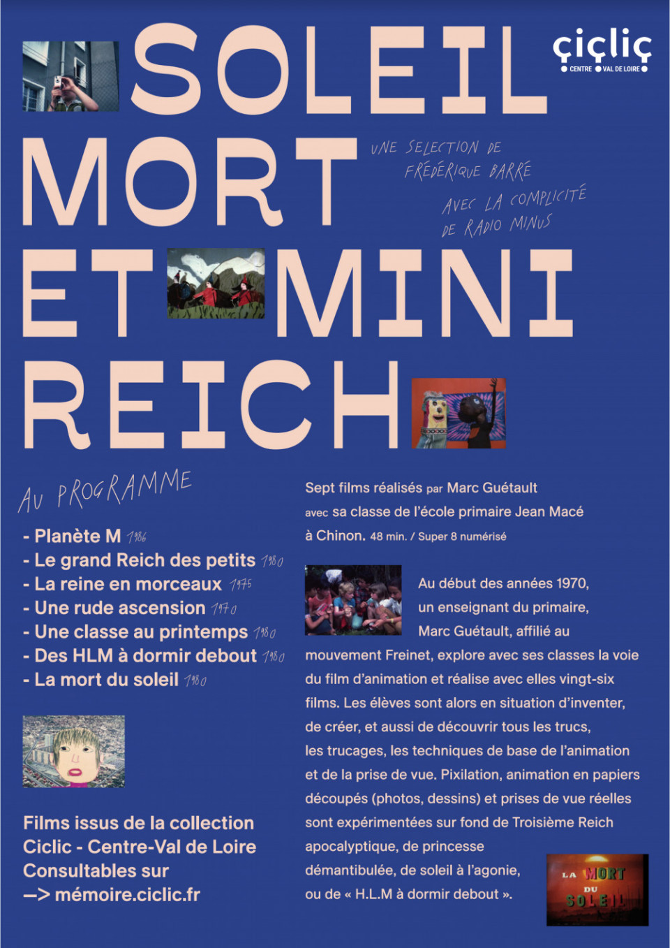 Au début des années 1970, un enseignant du primaire, Marc Guétault, affilié au mouvement Freinet, explore avec ses classes la voie du film d’animation et réalise avec elles vingt-six films. Les élèves sont alors en situation d’inventer, de créer, et aussi de découvrir tous les trucs, les trucages, les techniques de base de l’animation et de la prise de vue. Pixilation, animation en papiers découpés (photos, dessins) et prises de vue réelles sont expérimentées sur fond de Troisième Reich apocalyptique, de princesse démantibulée, de soleil à l’agonie, ou de « H.L.M à dormir debout ».