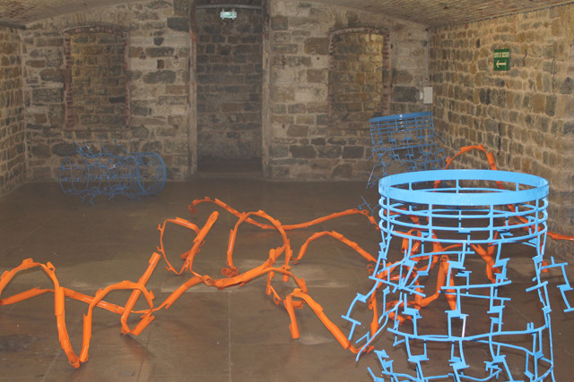 Chambres d’hôtes est l’occasion d’une lecture originale de cet espace cloisonné, conçu pour se protéger du monde. Ce lieu chargé d’histoire a été conçu pour l’autonomie et le confinement, par rapport au corps social compte tenu de ses fonctions. Cet été, il se laisse occuper par des œuvres d’art contemporain. Elles fonctionnent comme autant d’ouvertures dans cette architecture labyrinthique. Le 19, Centre régional d’art contemporain de Montbéliard a invité 5 artistes à y présenter sculptures, installations et vidéos, qui entre autres, interrogent et revisitent notre environnement, notre histoire et notre société. Leur réflexion porte sur les rapports sociaux, la relation de l’homme à la nature et au bâti, ainsi qu’à leurs avatars dans la société de consommation. Elles questionnent leurs implications dans le paysage. C’est pourquoi les artistes empruntent, synthétisent et souvent montrent à voir les attitudes psychiques, les pratiques collectives et l’usage des objets qui nourrissent notre quotidien.