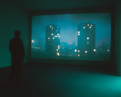Dans « Les grands ensembles » de Pierre Huyghe, les spectateurs sont confrontés à la vision nocturne de deux barres HLM. Par le biais de la lumière et de son mouvement une vie semble progressivement surgir de ces bâtiments sans âme. Leurs façades ou plus précisément leurs fenêtres s’éclairent les unes après les autres. Elles composent une sorte de langage, de geste visuel et lumineux inspiré du morse. S’institue un « dialogue » entre les façades. On est ainsi placé dans une ambiguïté visuelle qui rend floue la frontière entre réel et fiction. Cette vidéo avait été présentée pour la première fois à la Biennale de Venise en 2001. Pierre Huyghe est né en 1962, il vit à New York. Il est représenté par la Galerie Marian Goodman.