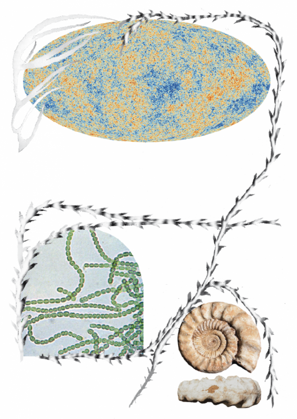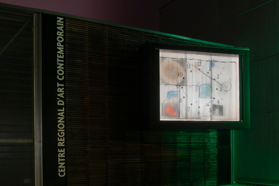 A l’approche du solstice d’hiver et pour cette Box de Noël, l’installation Membrane de Léa Chemarin est une œuvre évoluant au rythme du cycle nycthéméral(1). Deux rideaux se juxtaposent verticalement : le premier, seul visible le jour, représente une horloge, instrument de mesure du temps ; le second, révélé à la tombée de la nuit, rassemble des éléments iconographiques évoquant différentes formes de vie qui s’animent, plus particulièrement, lorsque les Humain·es, eux, s’arrêtent. La transparence du matériau favorise un principe de transferts et de juxtapositions et joue des variations rythmiques et naturelles de la luminosité. Ainsi, ces deux rideaux-membranes, vibrent à la fin du jour de cette conversation cosmique rêvée entre différent×es habitant×es de la Terre.