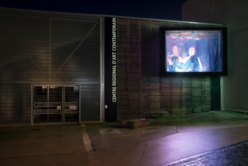 Cette peau-peinture se déploie ici dans la vitrine du centre d’art. Les percées forment deux silhouettes qui laissent entrevoir un espace intérieur, une étincelle.