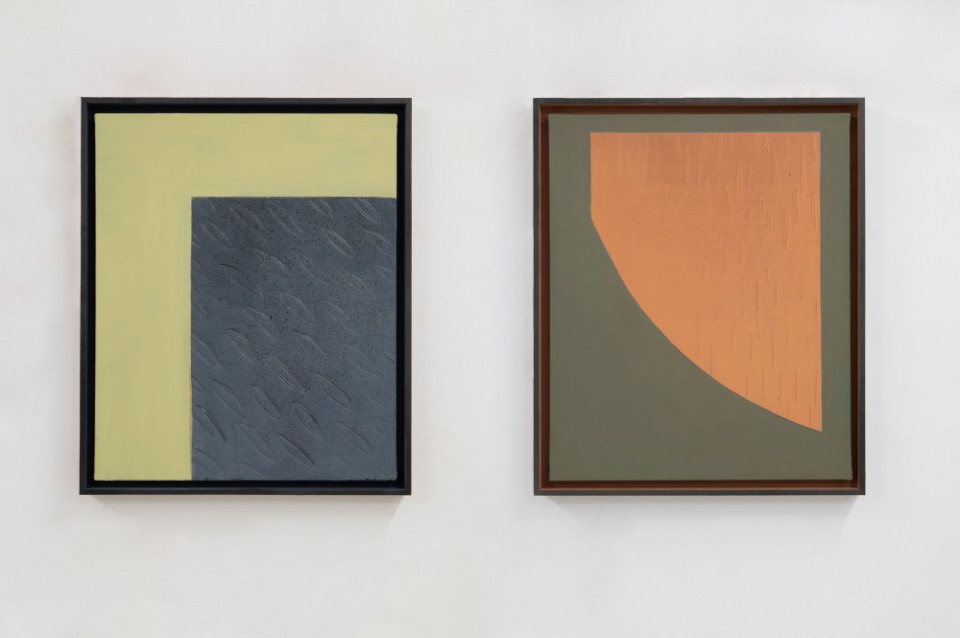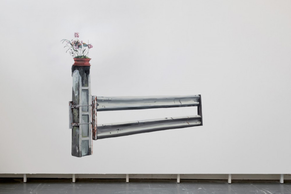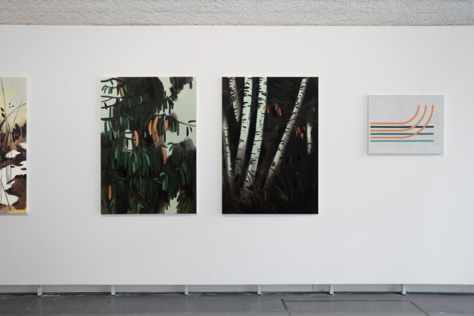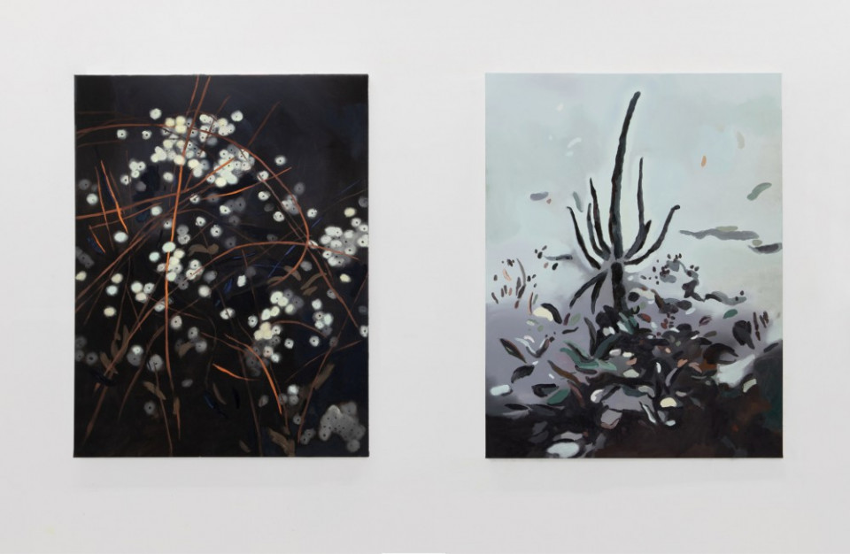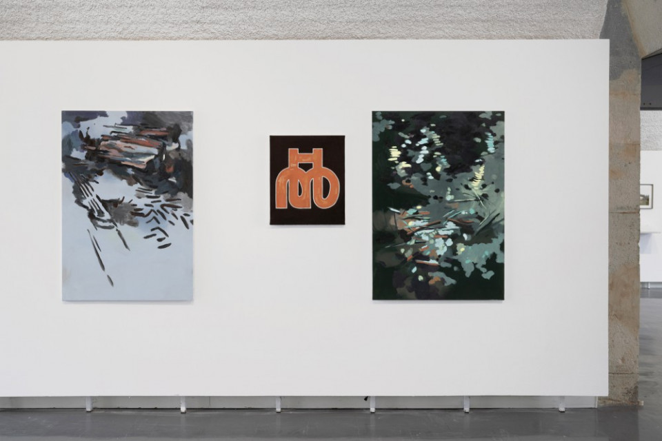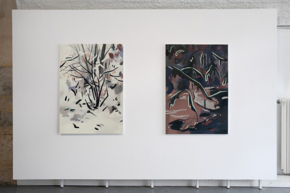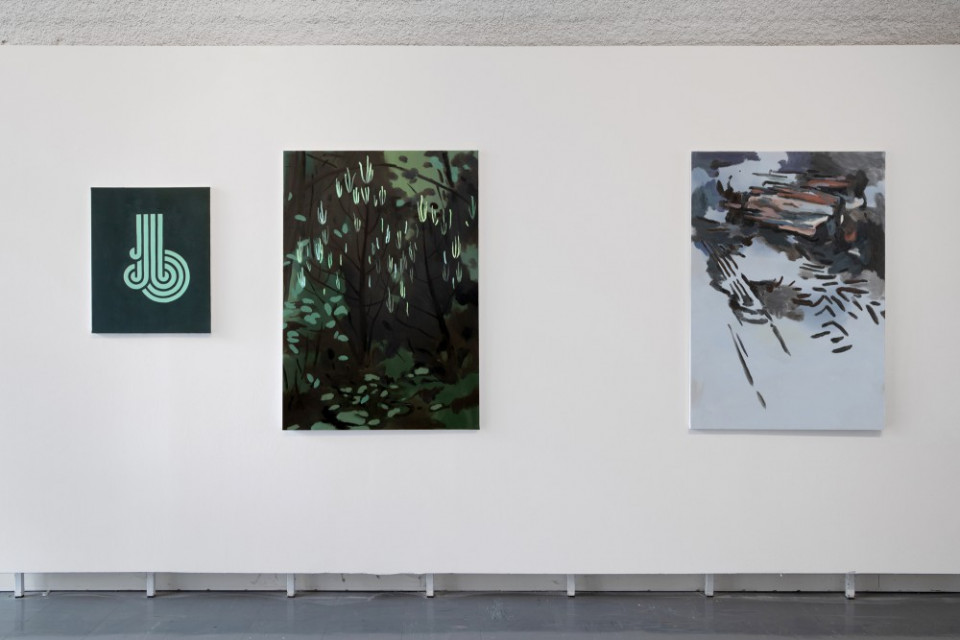 Plus récemment, la série Braconnage reprend l’idée d’emprunt sauvage de formes et de teintes dans les campagnes françaises. Dans cet ensemble, en apparence, deux abstractions se côtoient : d’une part une végétation simplifiée dans son dessin et son nuancier, dont les teintes opaques aplatissent le sujet à l’avant du tableau, et d’autre part une signalétique industrielle qui semble être la cristallisation géométrique de ce même nuancier. Mais si l’extrait de paysage subit un travail d’interprétation (de dénaturation), la signalétique est reproduite de manière fidèle, c’est une peinture figurative qui reprend de manière réaliste une abstraction géométrique existante et cherche à retrouver le geste technique du peintre d’enseigne. Si nous pensions reconnaître la représentation d’une réalité dans cette série, elle n’est pas tant dans les motifs naturels qui nous évoquent le camouflage (technique mise au point par un jeune peintre enrôlé dans la première guerre mondiale) mais au contraire dans la reproduction fidèle de ces peintures utilitaires. Braconnage est donc un ensemble de diptyques dans lesquels les formes culturelles côtoient les formes naturelles sans s’opposer au sein d’une même peinture mais au contraire en dialoguant, côte à côte, tout comme le font les signes qui s’intercalent dans un paysage que l’on traverse.
