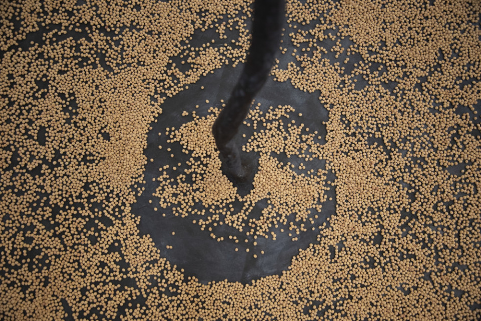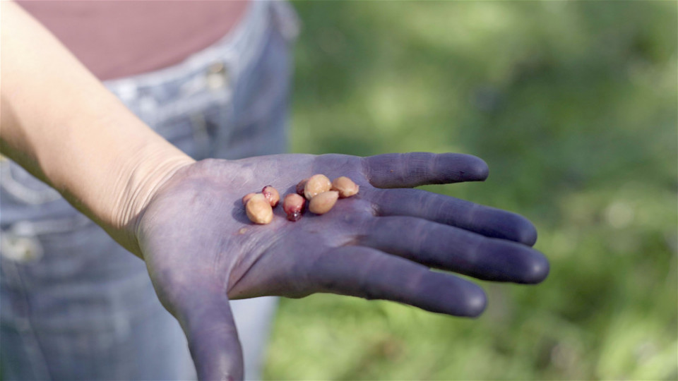 C’est dans cette même région, à Fougerolles, qu’elle a conçu le projet pluridisciplinaire Crystal Kirsch entre 2020 et 2022, mené au rythme de la production locale de la fameuse eau-de-vie et de certaines de ses réalités économiques, techniques, sociales et symboliques. Le titre de l’exposition, Pas de cerise sans noyau, est également celui d’une œuvre vidéo réalisée avec l’artiste anglais Sol Archer au fil des saisons de la culture des cerises : l’été pour la récolte, l’hiver pour la distillation et le printemps pour la floraison. Celle-ci rend compte du cycle végétal et du travail des agriculteur·ices : de l’arbre, à la fleur, au noyau, et au fruit, un cycle malheureusement aujourd’hui déstabilisé(5). Le Kirsch AOC de Fougerolles se distingue par son arôme à la note subtile d’amande, graine molle qui réside à l’intérieur du noyau. Ce dernier constitue ainsi l’élément incontournable de ce récit : organe reproducteur garant du cycle de vie et, par extension, de la continuité de la production des cerises et de l’eau-de-vie, il est également l’élément que l’on retire de l’alambic(6) à l’issue de la distillation de l’Aqua vitae (eau-de-vie), élixir d’immortalité. Dans l’installation de Ju Hyun Lee conçue pour le 19, Crac, de multiples noyaux en recherche d’un terrain fertile se mêlent à la couleur bleue. Indissociable pour l’artiste de son expérience à Fougerolles, cette couleur évoque tout autant les variétés de cerises « noires »(7) arrivées à pleine maturité que les paumes des bouilleurs de cru en résistance durablement teintées de leurs marques violacées ou encore que les mystérieux cristaux contenus dans les âmes(8) curatives de l’opération alchimique(9).