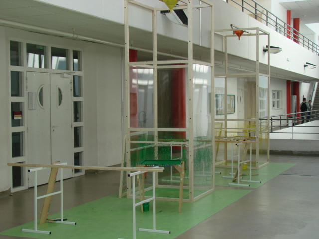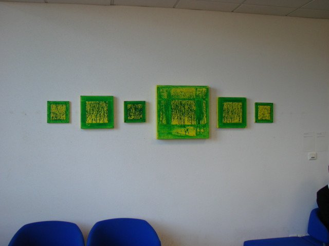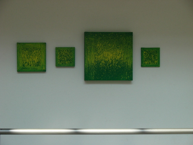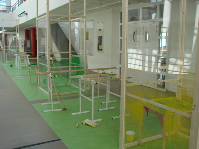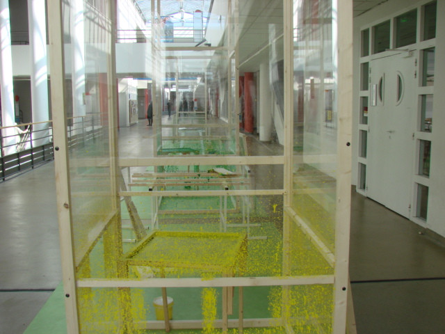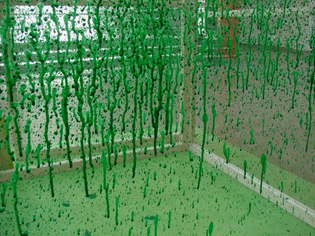Le dispositif pictural, matrice mise en place pour produire les peintures, prend une place à part entière de la démarche artistique mise en jeu. De multiples univers interagissent dans ce dispositif. Les serres sont pour moi des « machines ». Les outils que je développe et la réalisation en série de peintures renvoient à une logique de production « industrielle ». Pourtant la nature de « la machine » et le processus que le travail met en jeu par les « arrosages » successifs de la toile, peut se rapprocher d’une pratique agricole. Cette pratique ouvre un champ d’expérimentation qui confère à l’œuvre une réminiscence de pratiques scientifiques. Par un mélange de physique et de chimie - mesure de volume, calcul de concentration - je tente de maîtriser la dynamique de rebond qu’engendrent mes coulures picturales.