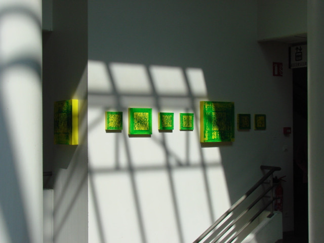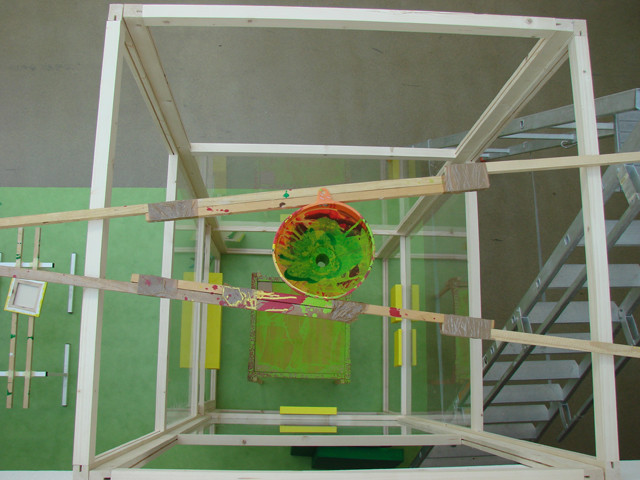 La nature du dispositif (démontable), le fonctionnement de la matrice (qui produit puis s’efface), le mode d’inscription de la peinture sur la toile (effet de gravité, rebond, flux, recadrage), tout participe à la construction et à la déconstruction, la contextualisation et l’autonomie, à l’unité et à l’appartenance à un tout et dresse ainsi un univers sémantique à l’image de la condition humaine.