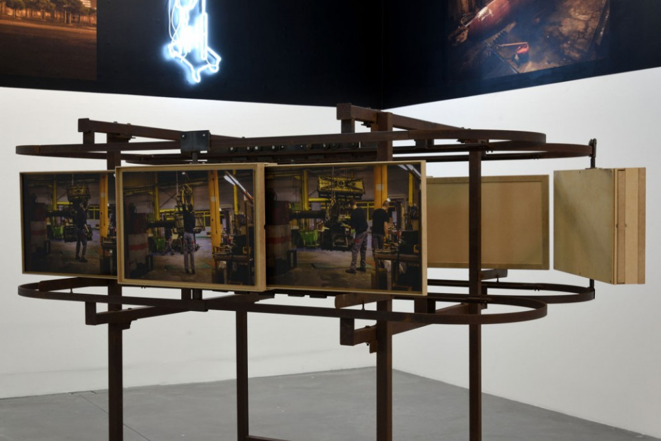 L’artiste pose un regard aigu sur l’actualité économique et sociale, et chaque nouveau corpus est précédé de rigoureuses recherches telles que les dévoilent les écrits dont il accompagne fréquemment ses œuvres. Il élabore ensuite des «dispositif d’images» ou, à l’inverse, «objets prétextes à images», pour reprendre ses propres mots, dont chaque élément, matériau, cadrage et mode de monstration relève d’un choix minutieux à même de traduire ses constats sociologiques et visuels. C’est ainsi que le «manège à images» d’images de À la poursuite de l’extension des échanges réclame un effort physique pour le manipuler, renvoyant, ainsi que son esthétique industrielle, à la chaîne de montage et à la chorégraphie gestuelle des ouvriers au travail tels que nous les découvrent les photographies.