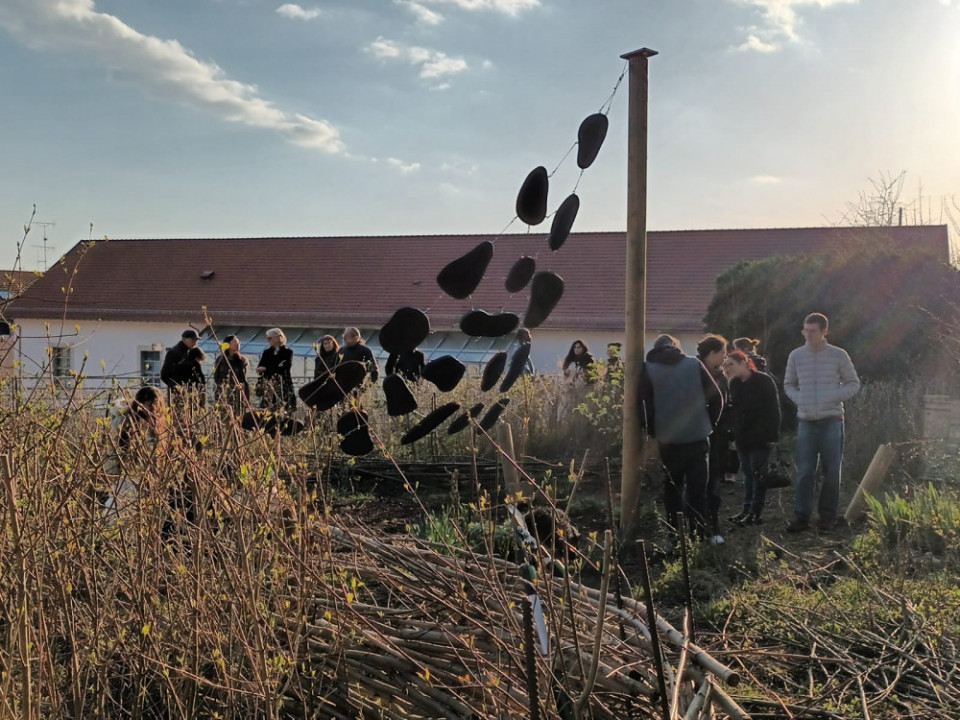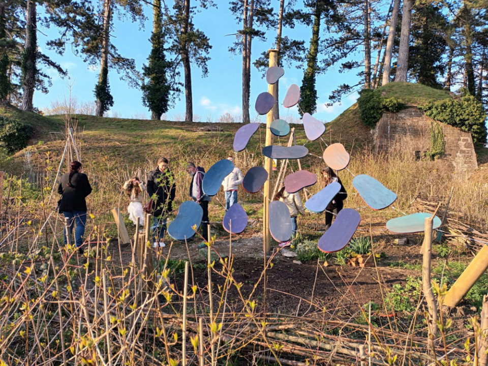 En lien étroit avec l’exposition Pas de cerise sans noyau au 19, Crac Ju Hyun Lee est conviée au mois d’avril 2023 à réaliser une œuvre in situ pérenne, Robe pour plantes (ombrage #1) et une conférence tous publics, Matières et vivants dans l’art contemporain, à l’École d’art de Belfort. S’inspirant d’une robe de 1977 du couturier Paco Rabanne en substituant des noyaux de cerises aux perles et petits cubes de bois initiaux, elle envisage de réaliser un habillage anti-sécheresse, pour les plantes des Jardins Suspendus de l’École. La structure porteuse en pin de cet ombrage sera recouverte de la même peinture à base de farine pigmentée employée pour ses sculptures au 19, Crac.