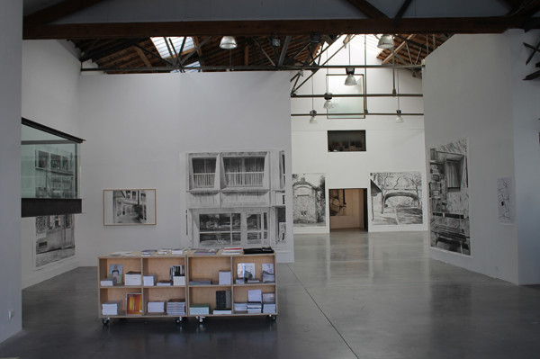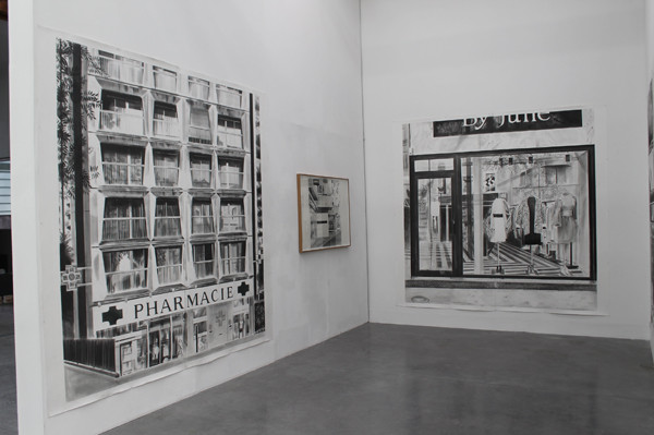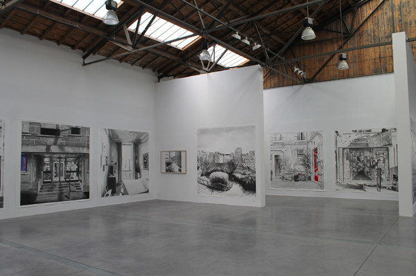 Depuis le début, il est important pour moi que l’image ne soit pas mécaniquement agrandie sur le support pour être dessinée ou peinte. Ma méthode s’apparente plutôt à la grille qu’on utilisait autrefois pour agrandir une image, ou bien au report de l’esquisse à l’échelle du tableau. Mais dès le début, j’ai eu besoin de dessiner ou de construire l’image, de voir les choix que je faisais, ce que je garde, ce qui va disparaitre. J’ai progressivement essayé d’intégrer au tableau des détails de plus en plus variés, des choses que je n’aurais pas pu peindre autrefois car elles m’auraient semblé anecdotiques ou sentimentales. D’où l’activité des habitants qui est comme induite dans les tableaux ou dessins. Cela répond à la question de l’absence de la figure qui inquiète souvent les spectateurs.