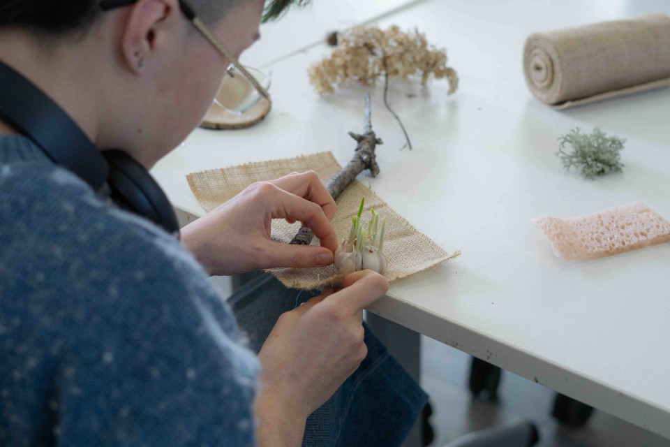 Durant ce workshop au rythme soutenu, les étudiant•es ont exploré différentes manières d’entrer en relation avec le vivant : épluchage, tressage, assemblage, juxtaposition avec des matériaux industriels. Iels ont ainsi pu éprouver leur capacité à accepter l’instabilité de la matière, la décoloration, la fragilité, l’altération, le dépérissement comme partie intégrante du processus.